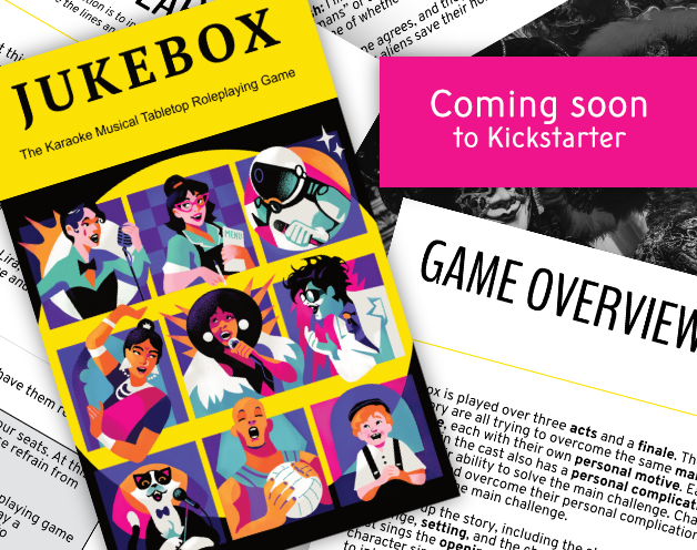 Jukebox: The Karaoke Musical Tabletop Roleplaying Game is a rules-lite, no-game-master required, roleplaying game for 3-4 players. Over three acts and four hours, you and your friends sing karaoke and create a musical story full of drama, passion, and spectacular showstoppers!