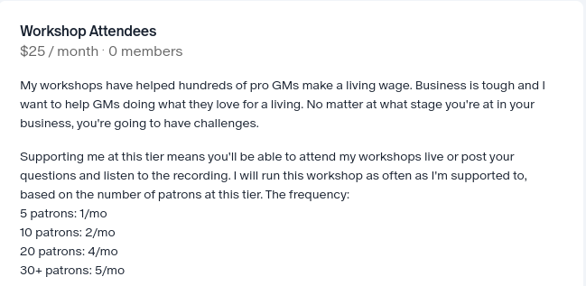 I’ve been running pro GM workshops for the past 2 years and have helped hundreds of pro GMs make a living wage. Bad news first: I am unable to continue doing so for free. The good news? It’s $25 a month to enjoy great up-to-date advice on from me on everything pro GMing via Patreon. I will record the workshops and upload them for patrons in the $25 tier.