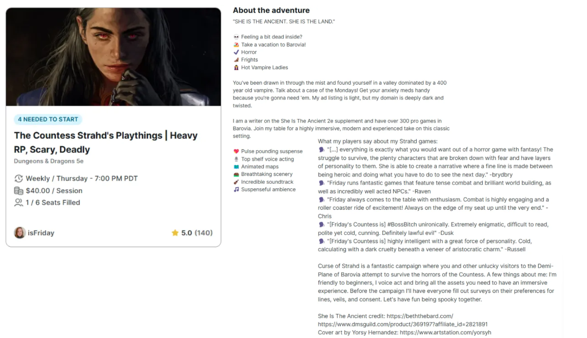 I’ve added a glut of “credibility” to this ad to assist in competing with inherent competition that goes alongside posting a popular module like Curse of Strahd. What separates your ad from others? You need to codify that as best you can. If you can get testimonials from your reviews that are specific to a campaign, all the better!