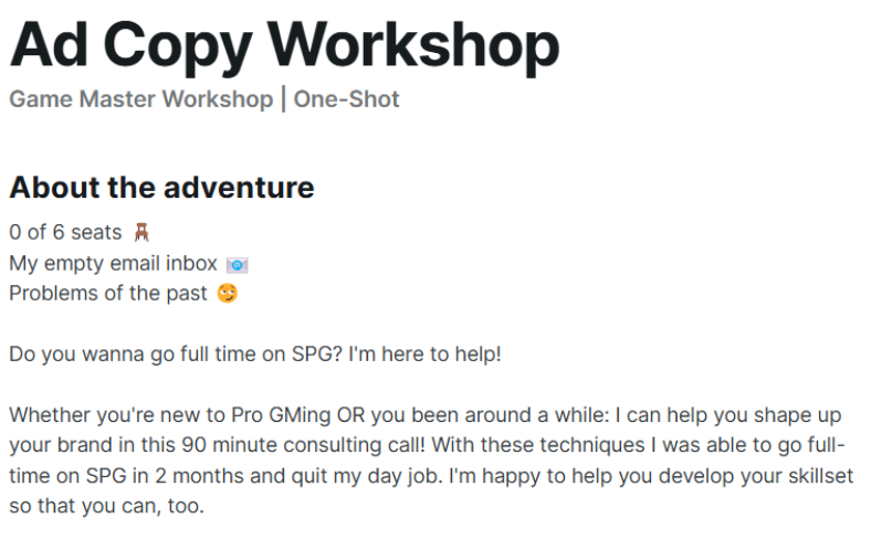 If you have more questions or want to chat with others about your pro GM efforts, join my Discord and hit up my #ad-copy-workshop channel, or the #pro-gm-help forum there. I’m also hosting another workshop on Monday and can individualize some attention as required.
