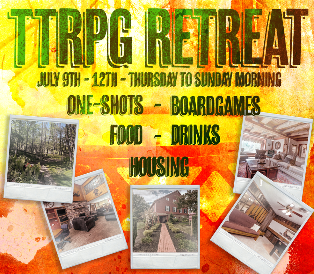 Me and 3 other pro GMs are hosting a cabin in the rural parts of Pennsylvania in July 9th-12th for a long weekend to enjoy a short campaign, one shots, catered food, and party games. Bathrooms and rooms will be shared, (think like a convention). You’ll just need to pack your clothes, dice, and deodorant. Space is limited!