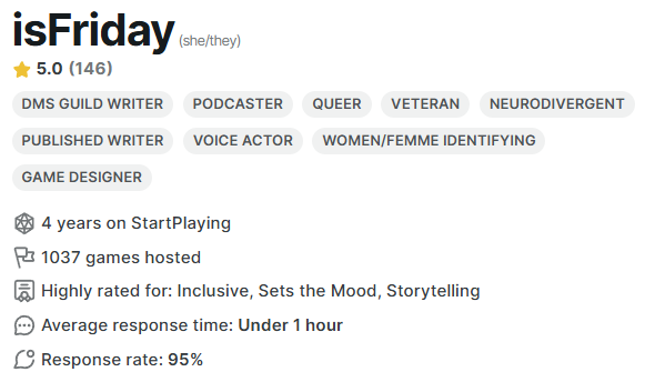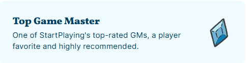 Devon, the COO at StartPlaying Games, has announced that they have been testing a “Top GM Badge” and panic has ensued in SPG Discord chat. It’ll get worse once it has rolled out for all users. GMs are feeling unfairly judged by a system that cares not for them or their players, but instead about raw stats. That’s just business, baby! The good news is that the badge helps everyone book more – the bad news is that it creates a heavier sense of crushing capitalism in our increasingly unstable economy.