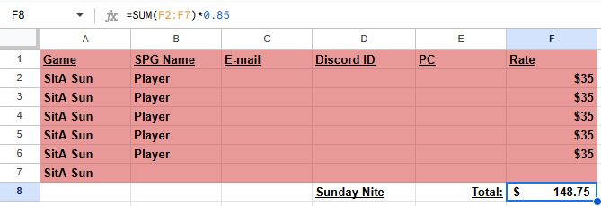 Utilizing a Google Sheets document I’ve put together to help you track your budget. It’s fairly simple. Create the columns with info you need and with the seat cost on the far right of each table. Then add the total together using the formula shown above, multiplying it by .85 to account for the cut that SPG takes. You can add an additional line to account for taxes, as well.