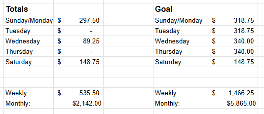 The bottom of the worksheet hosts a board for tracked current amounts of each table and compared to static goals that you can detail. These formulae are simple – they add together all the tables of any given day by tracking the cells and producing a sum (post-SPG cut). These combine to create a weekly and monthly stat with easy math. You may want to adjust this per month if tracking 5 week months separately from 4 week months is important to you.