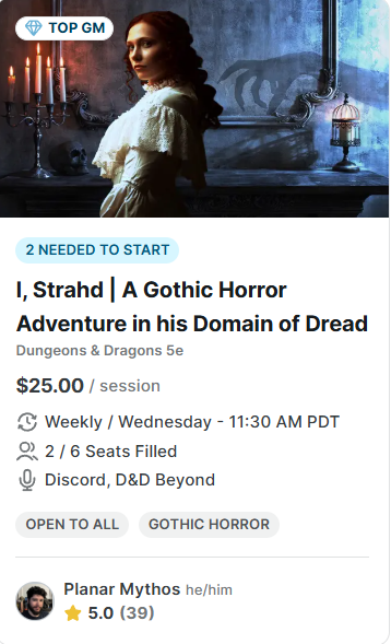 If you’d like to play a Curse of Strahd game with me (or Rime or Daggerheart or – or – or) sign up for one of my games on Start Playing!